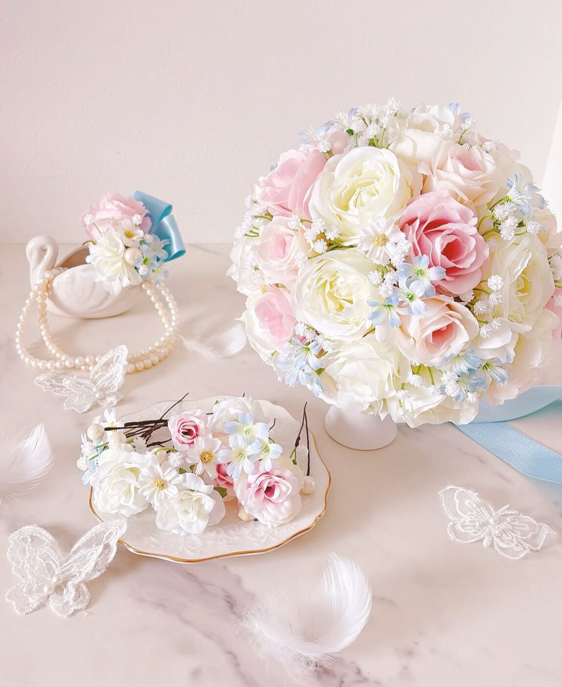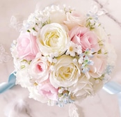 淡いピンク&ホワイトのローズに、カスミソウや水色の小花、ハイドレンジアを加えた、ふんわり可愛いブーケ。